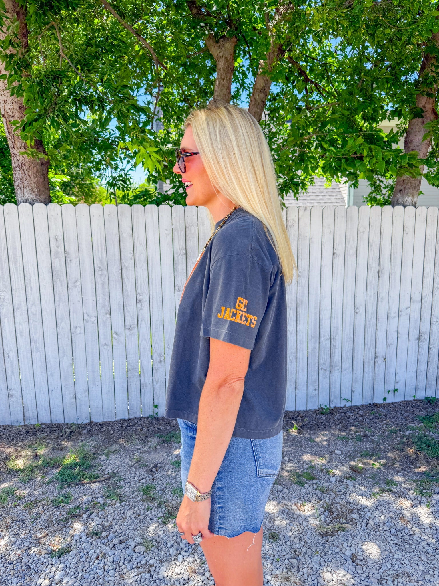 Show your hometown pride with this vintage-inspired Rockwall Yellowjackets Tee, featuring a bold orange “R” on a soft charcoal backdrop.