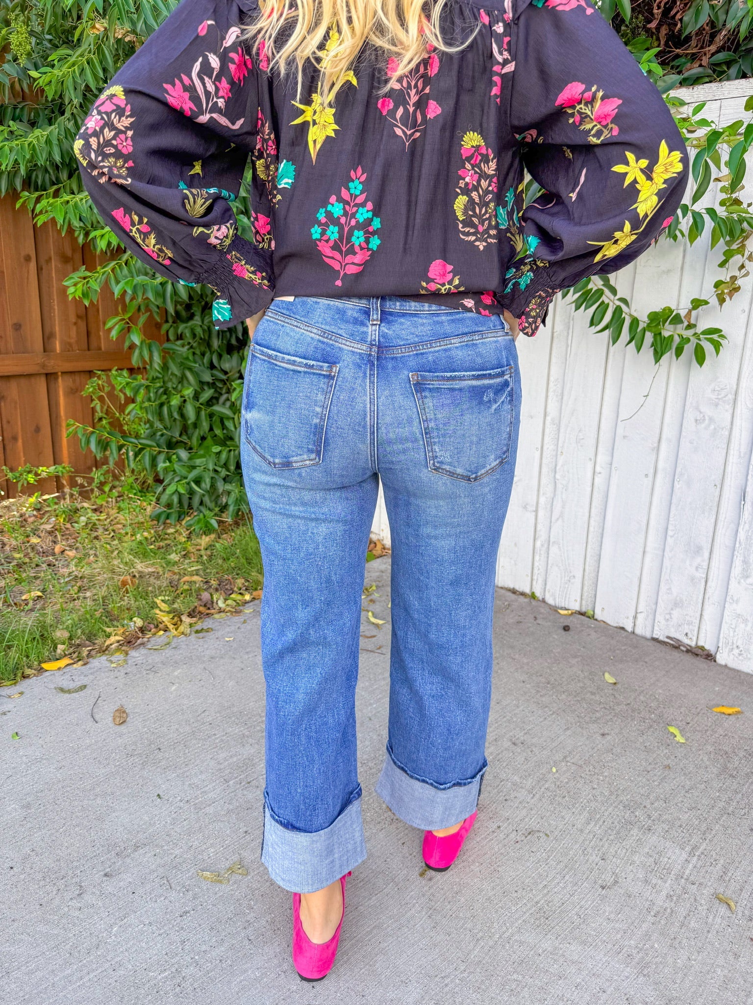 Elevate your everyday with these high-rise straight-leg jeans in a timeless medium wash. The roll-up hem adds a playful edge, while stretchy fabric ensures comfort that keeps up with your day.