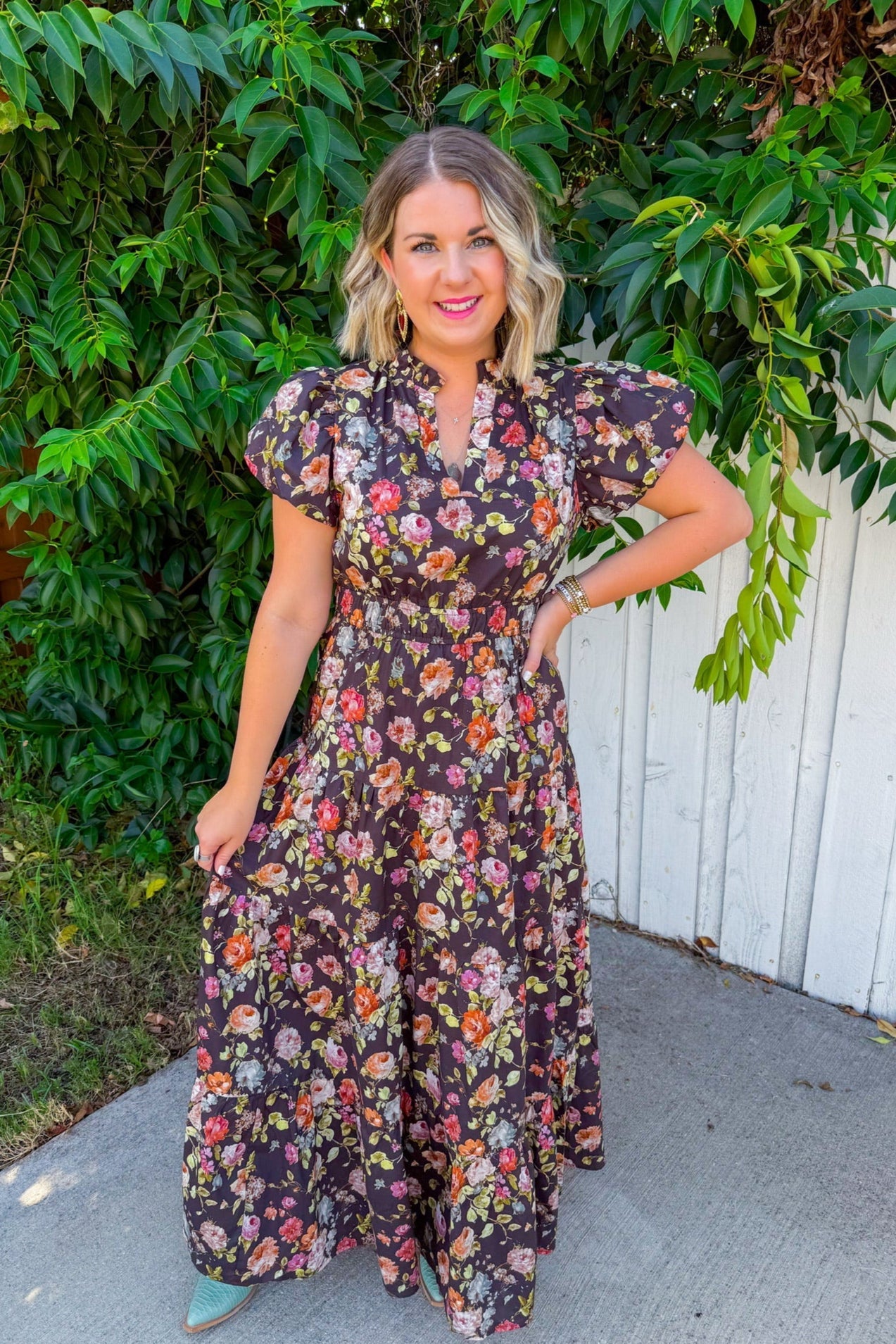 Black floral maxi with statement puff sleeves, a notch V-neck, and a comfy smocked waist—pretty for fall weddings, showers, and dinner dates.