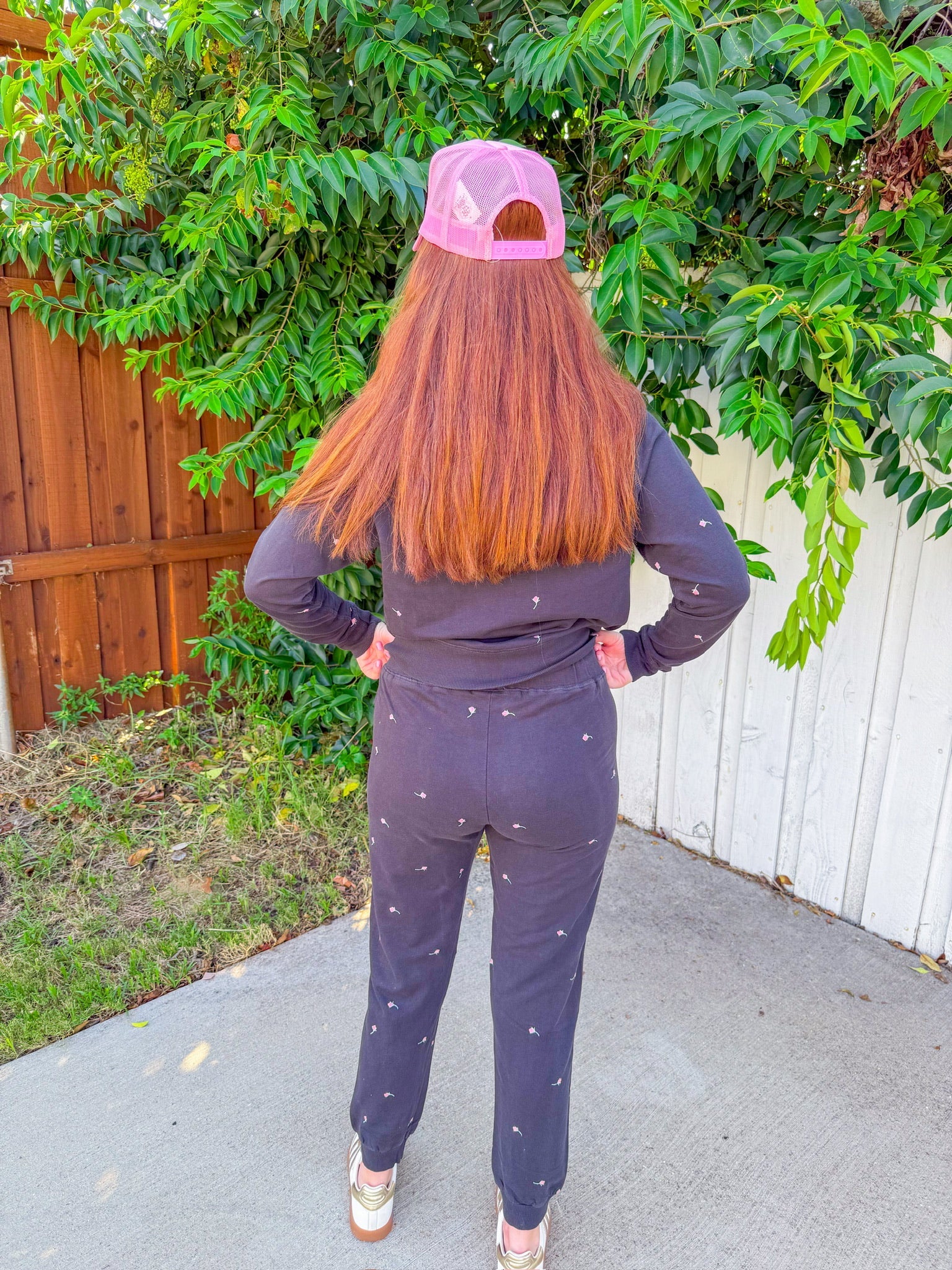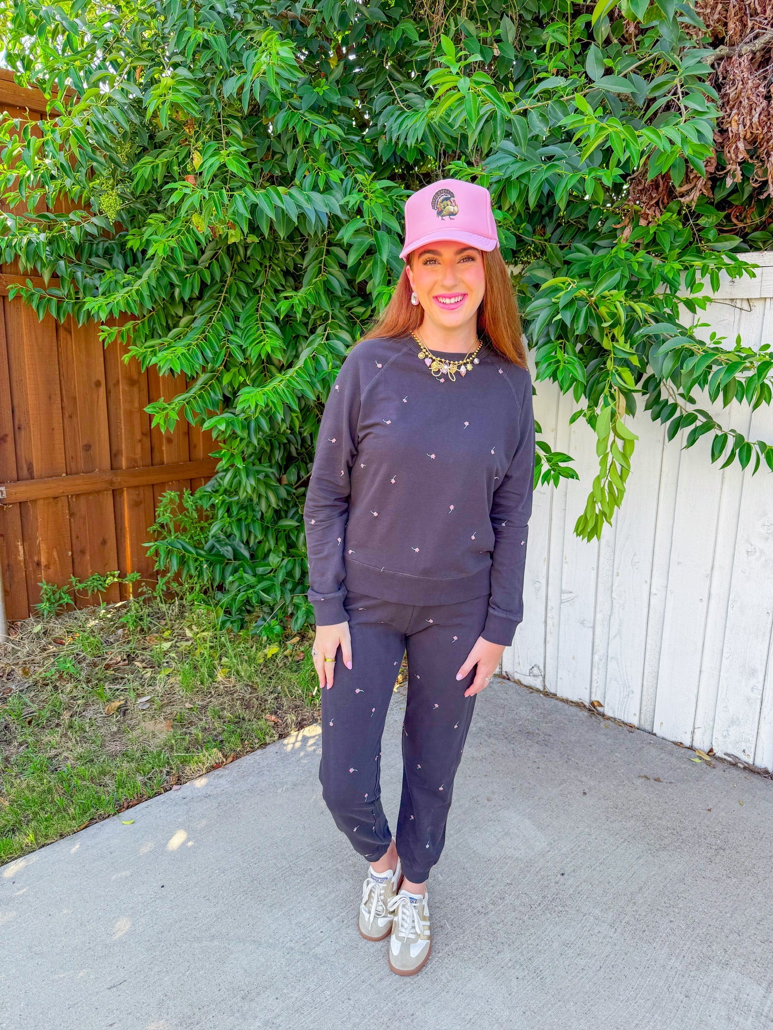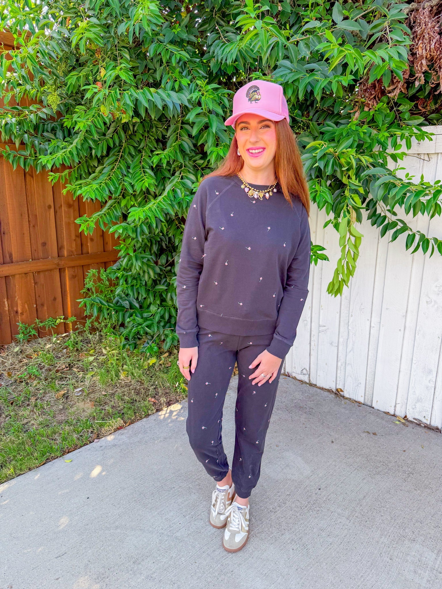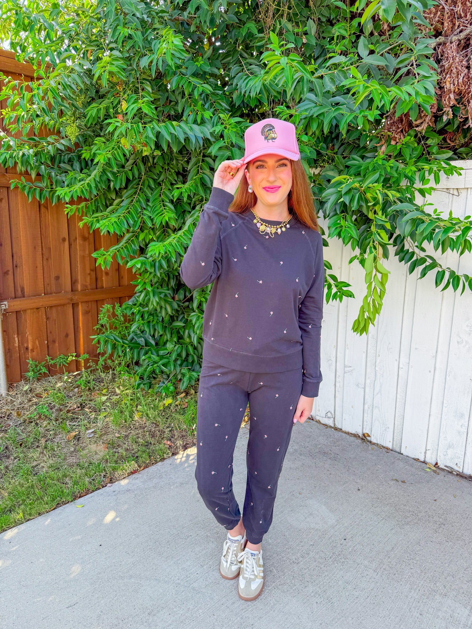 Charcoal crewneck sprinkled with tiny embroidered flowers—soft, relaxed, and made for cozy coffee runs or movie marathons. Pair with the matching joggers for a cute set, or half-tuck into straight-leg jeans and sneakers when you’re out and about.