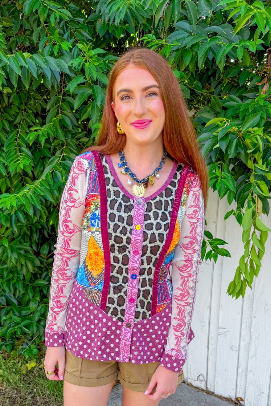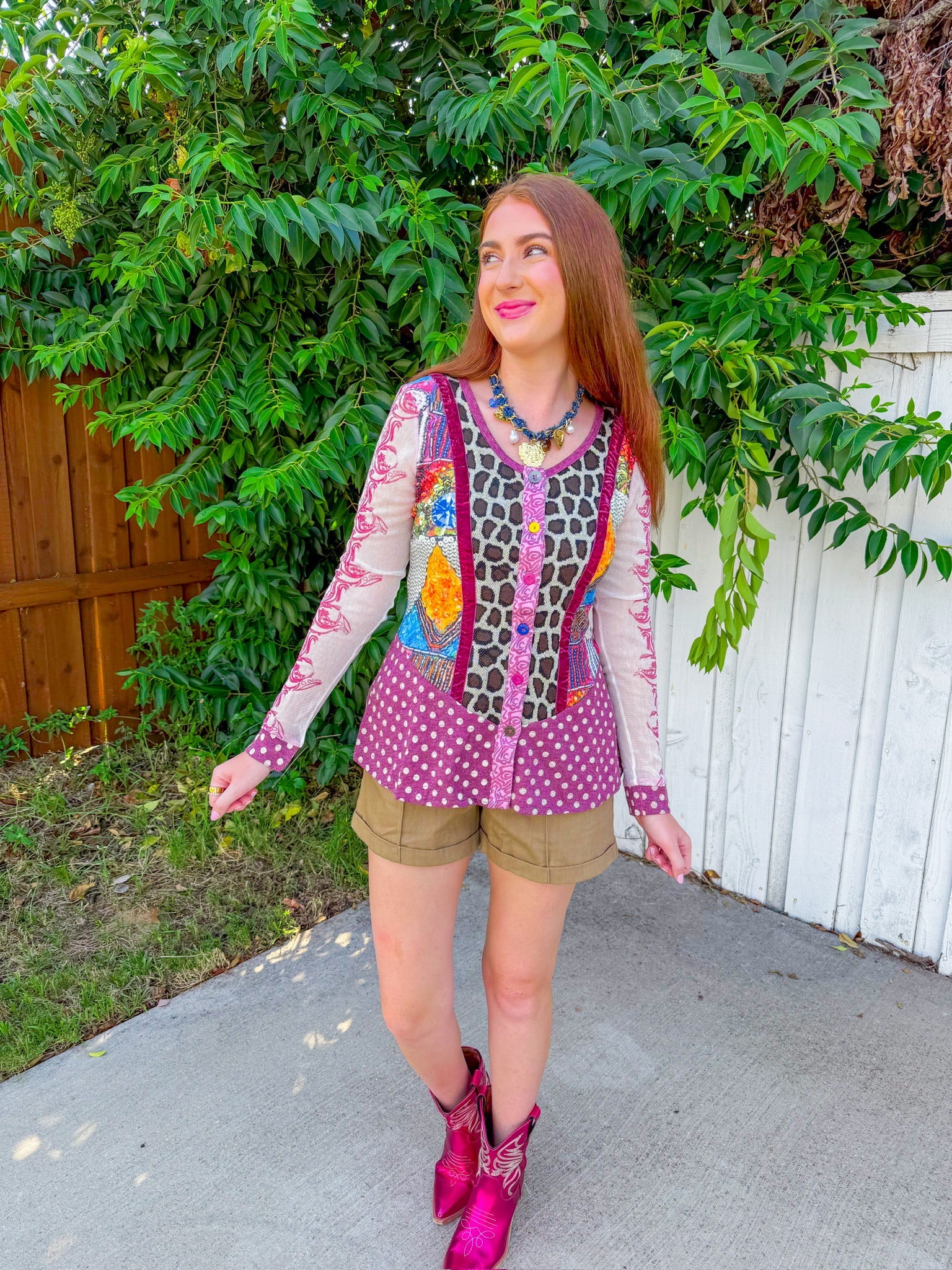 Patchwork cardigan with mesh sleeves, velvet piping, leopard center, and dotted peplum—colorful, quirky, and totally gallery-opening ready
