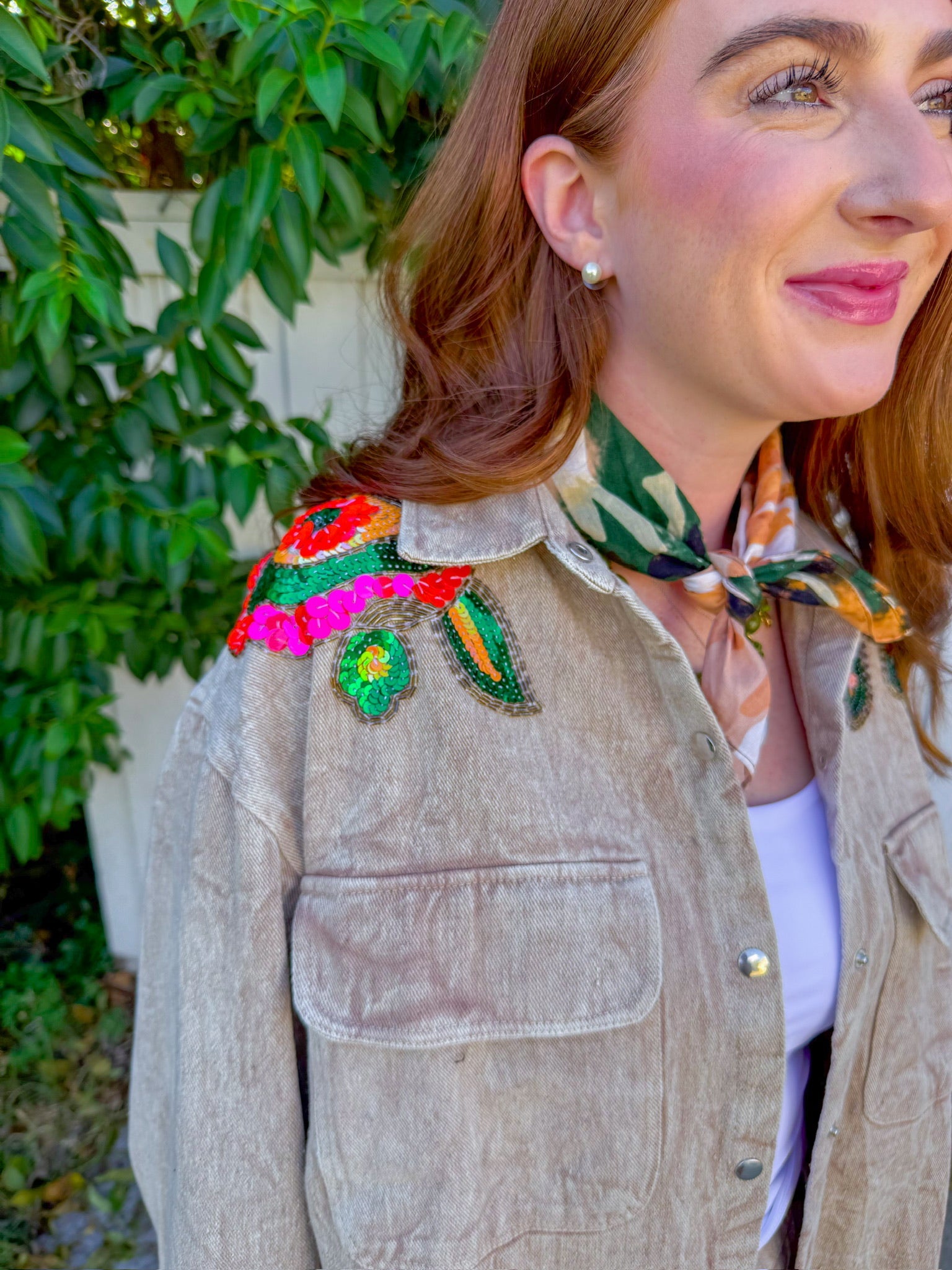 Taupe mineral-wash shacket with bright sequin shoulder appliqués—sparkly, Western-leaning, and festival-ready.