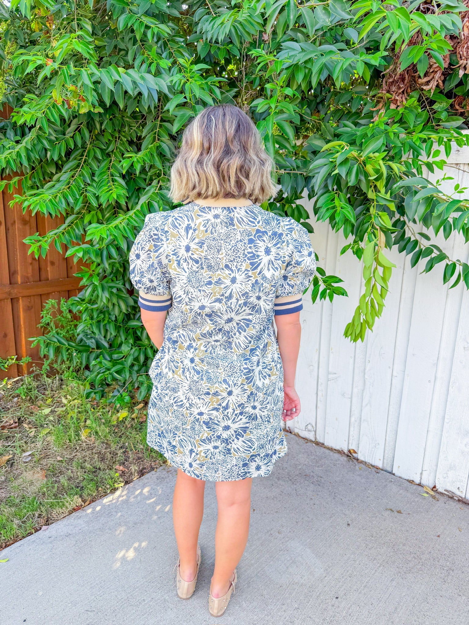 Navy-and-ivory floral quarter-zip dress with striped ribbed collar and cuffs—sporty meets chic for tailgates and Saturday brunch.