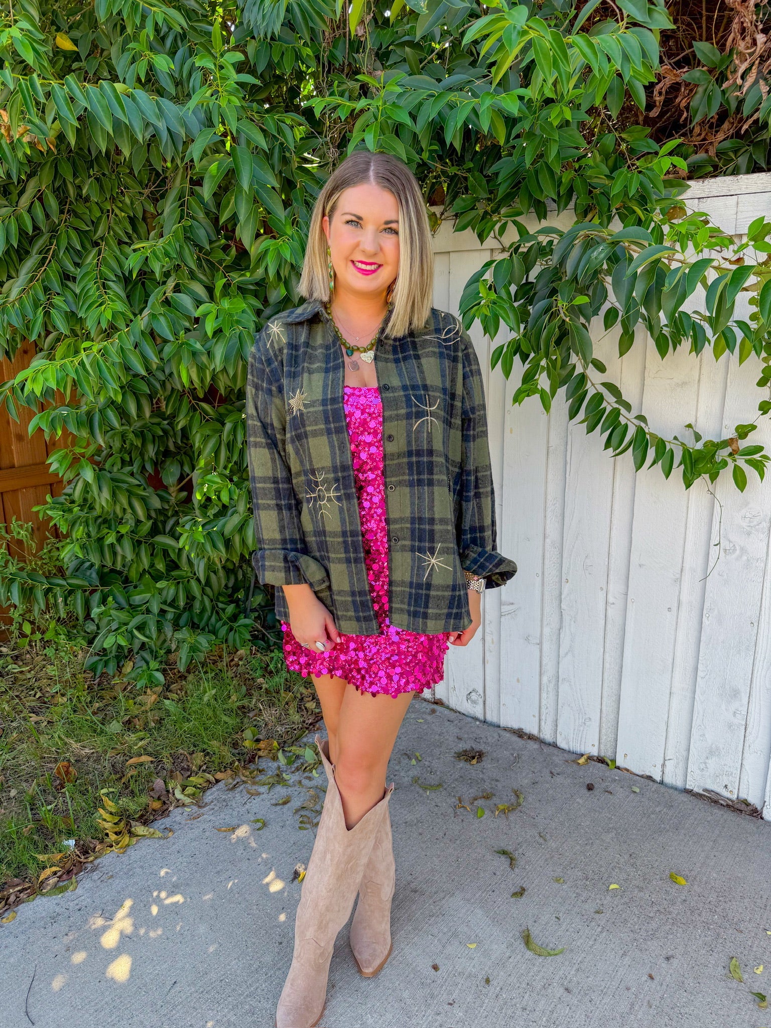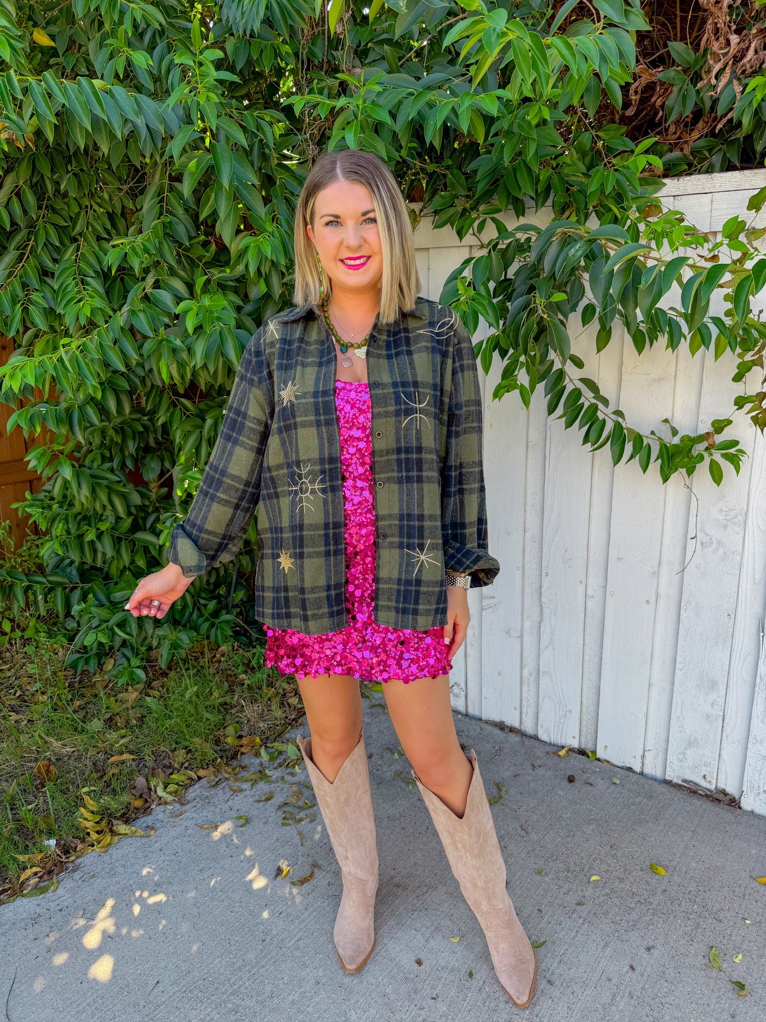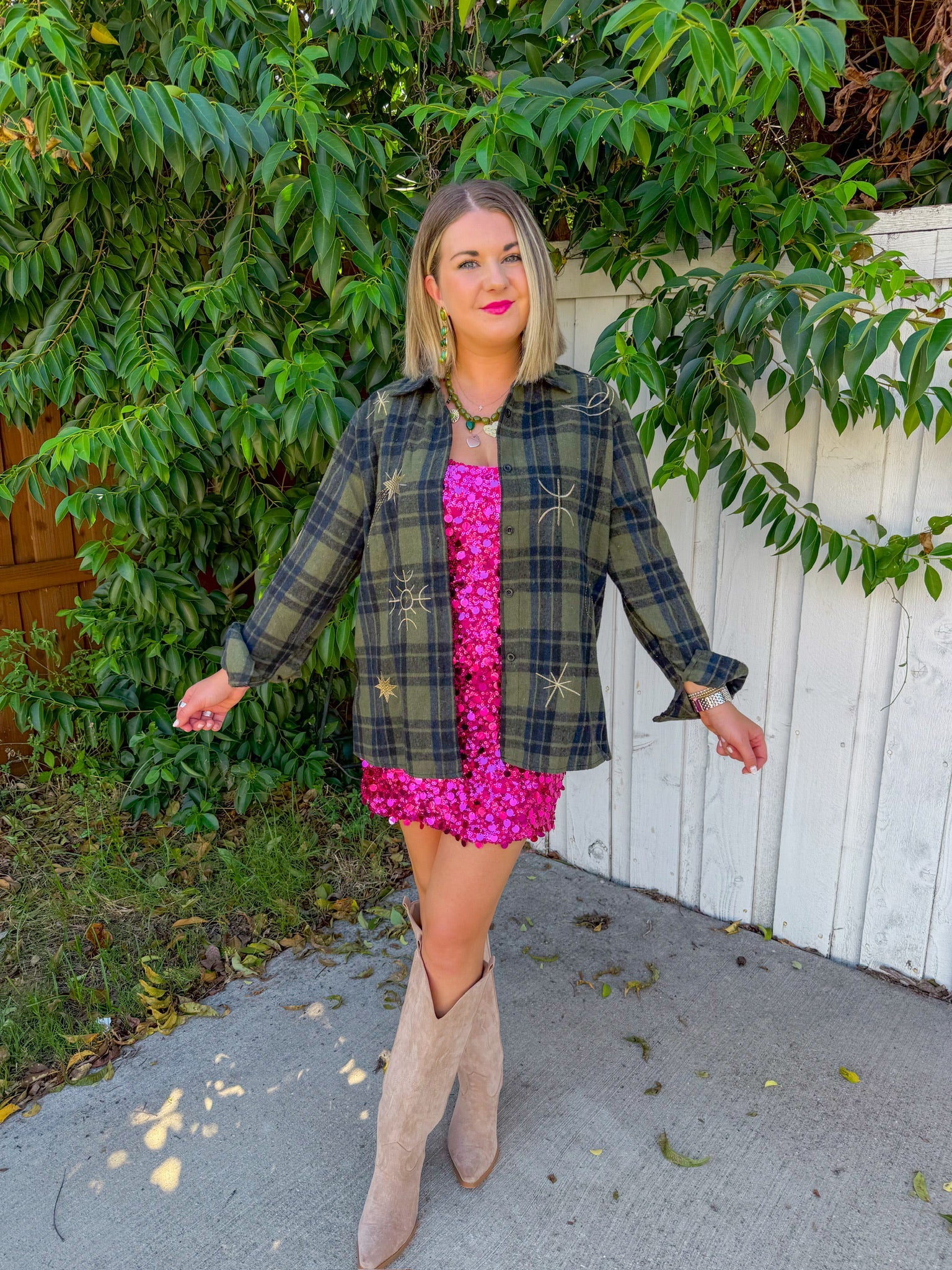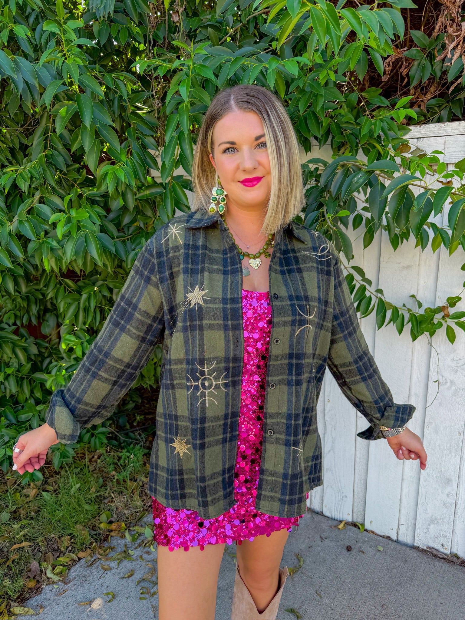 Olive-and-navy plaid button-down with crescent moon and star embroidery—soft, cozy, and a little cosmic for crisp fall days.
