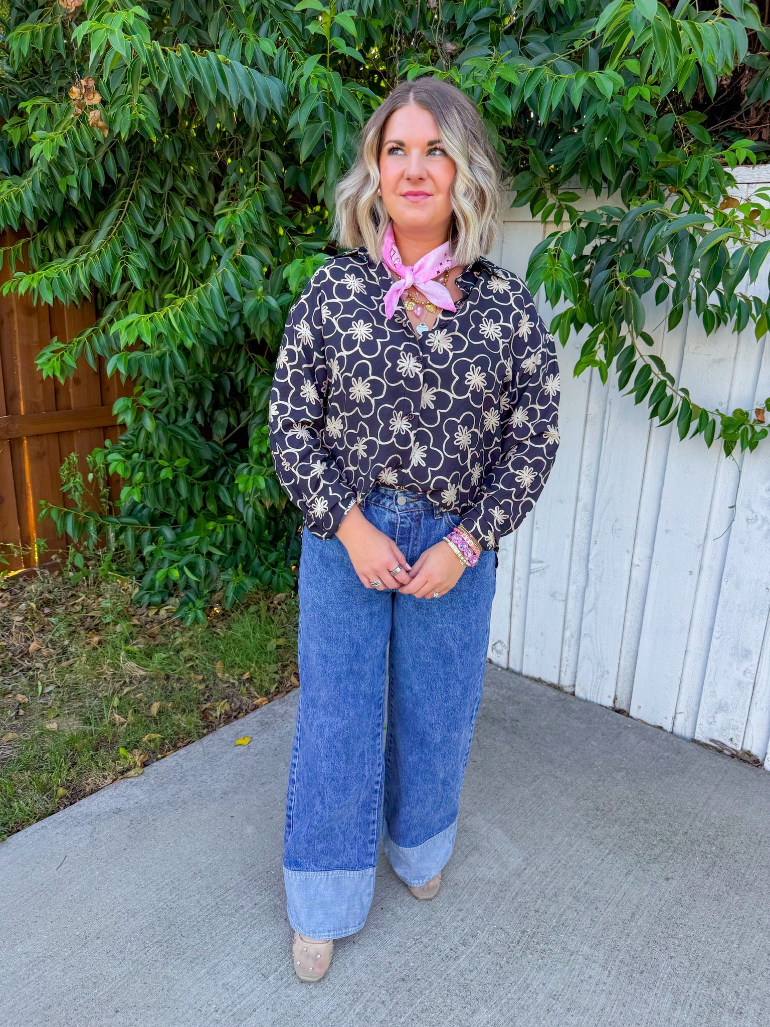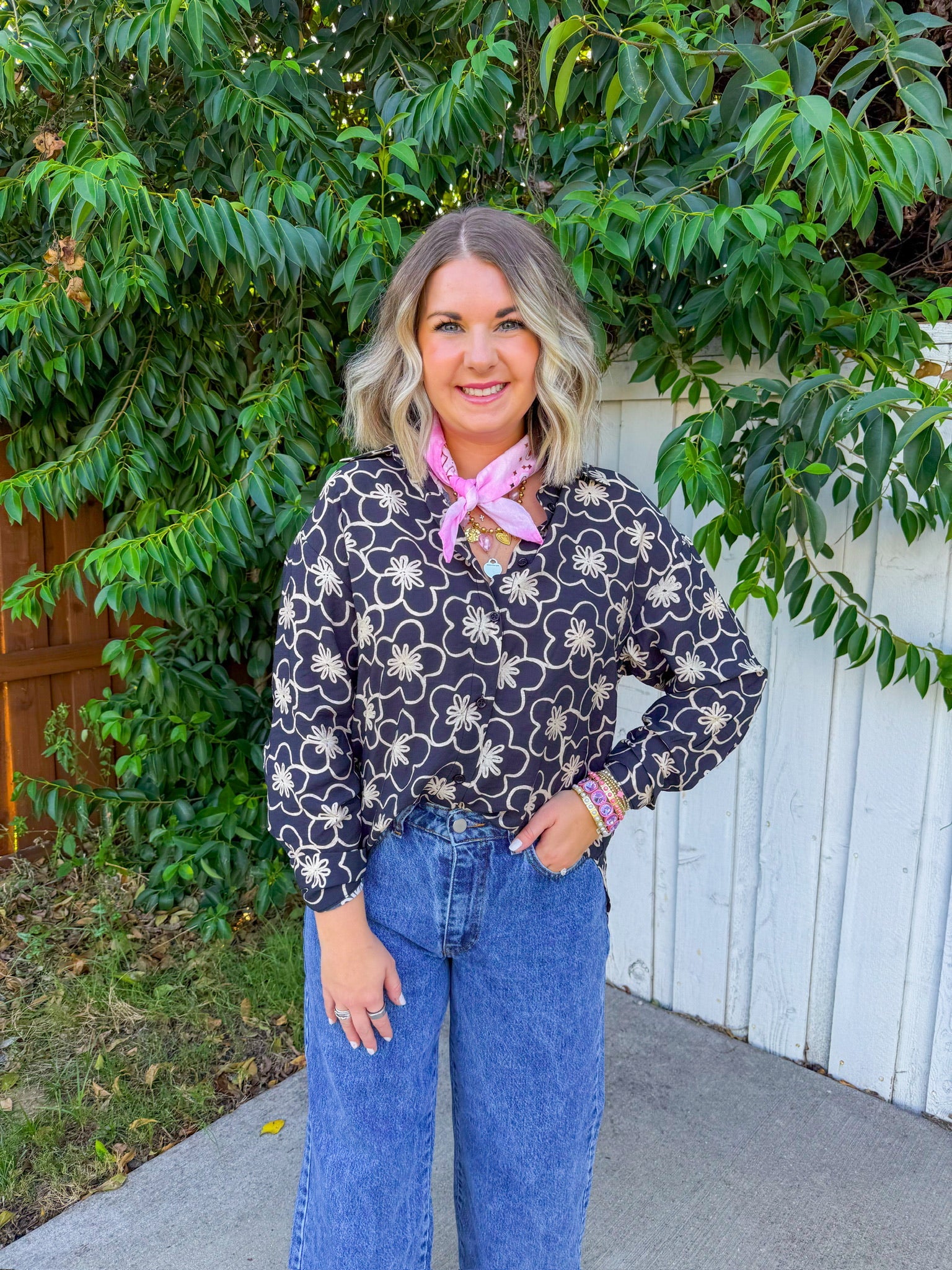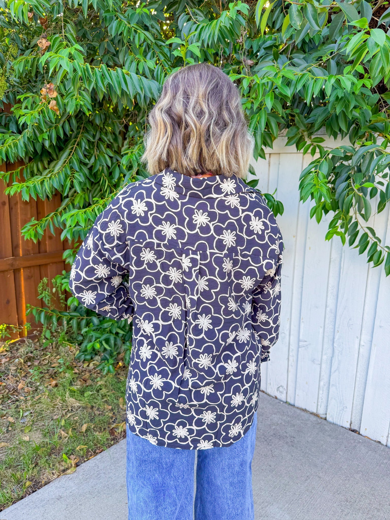 This black button-down pops with bold cream floral embroidery for a fun twist on a classic. Pair it with denim for an easy everyday look or style it with black trousers for something more polished.