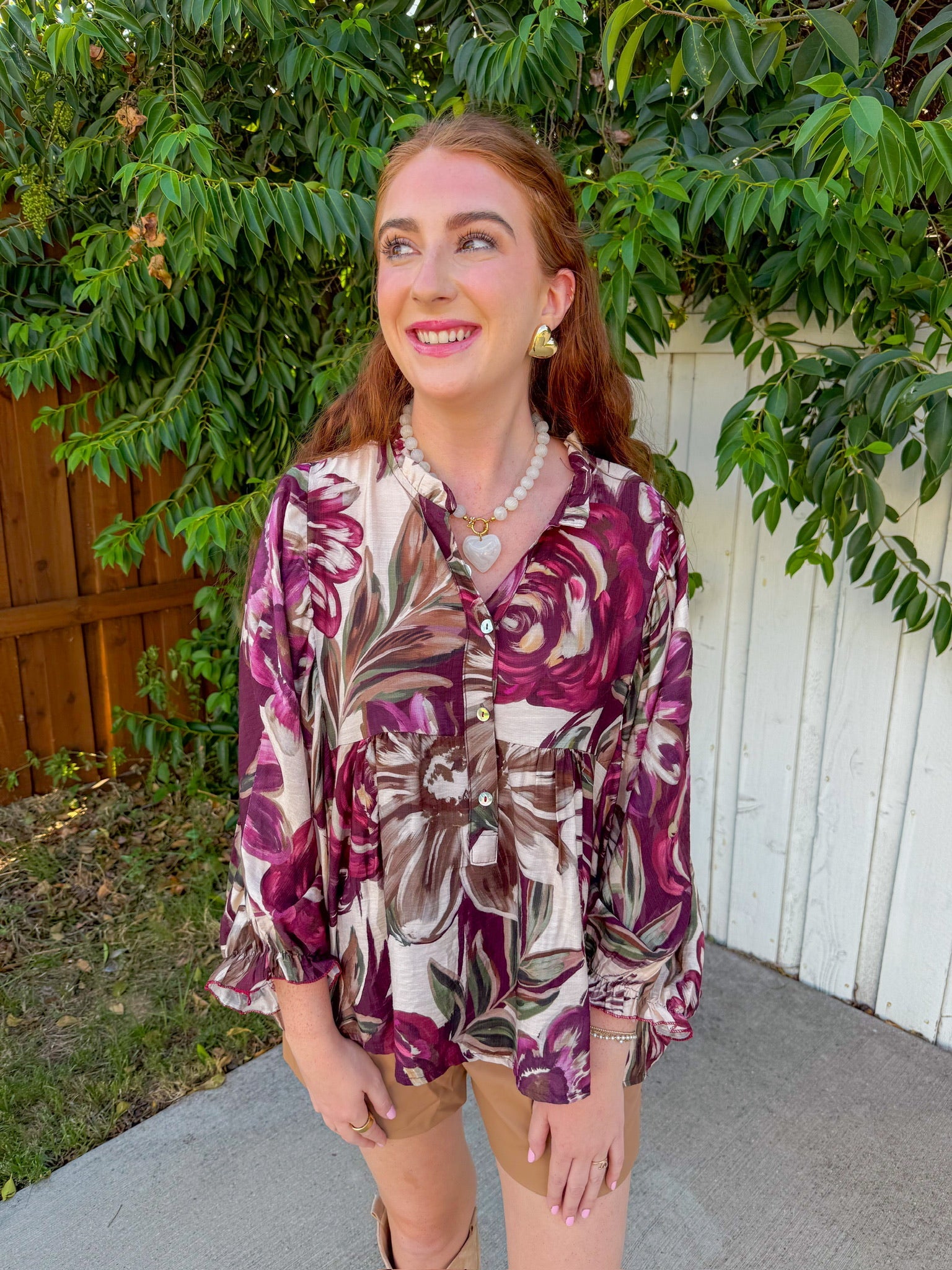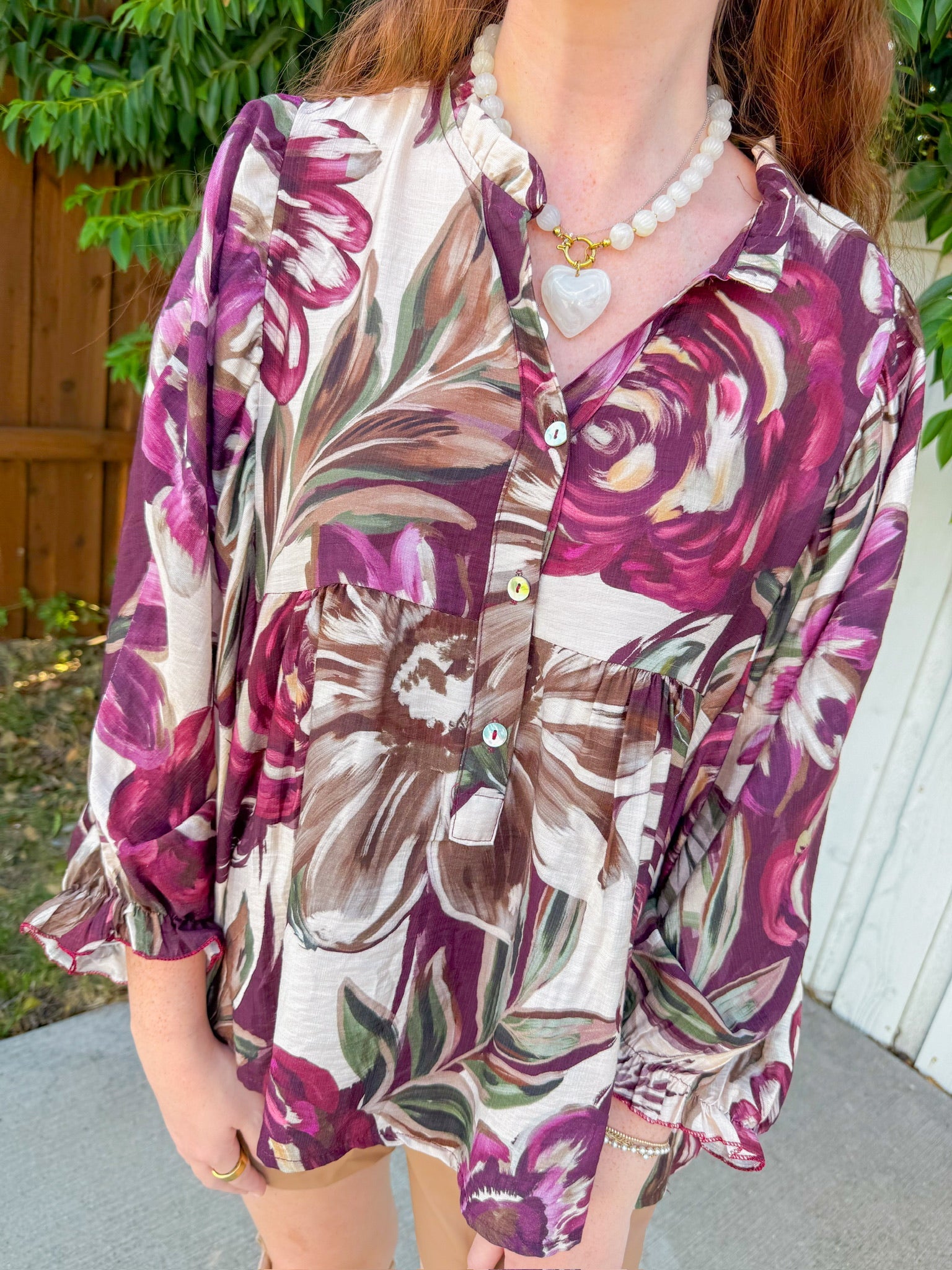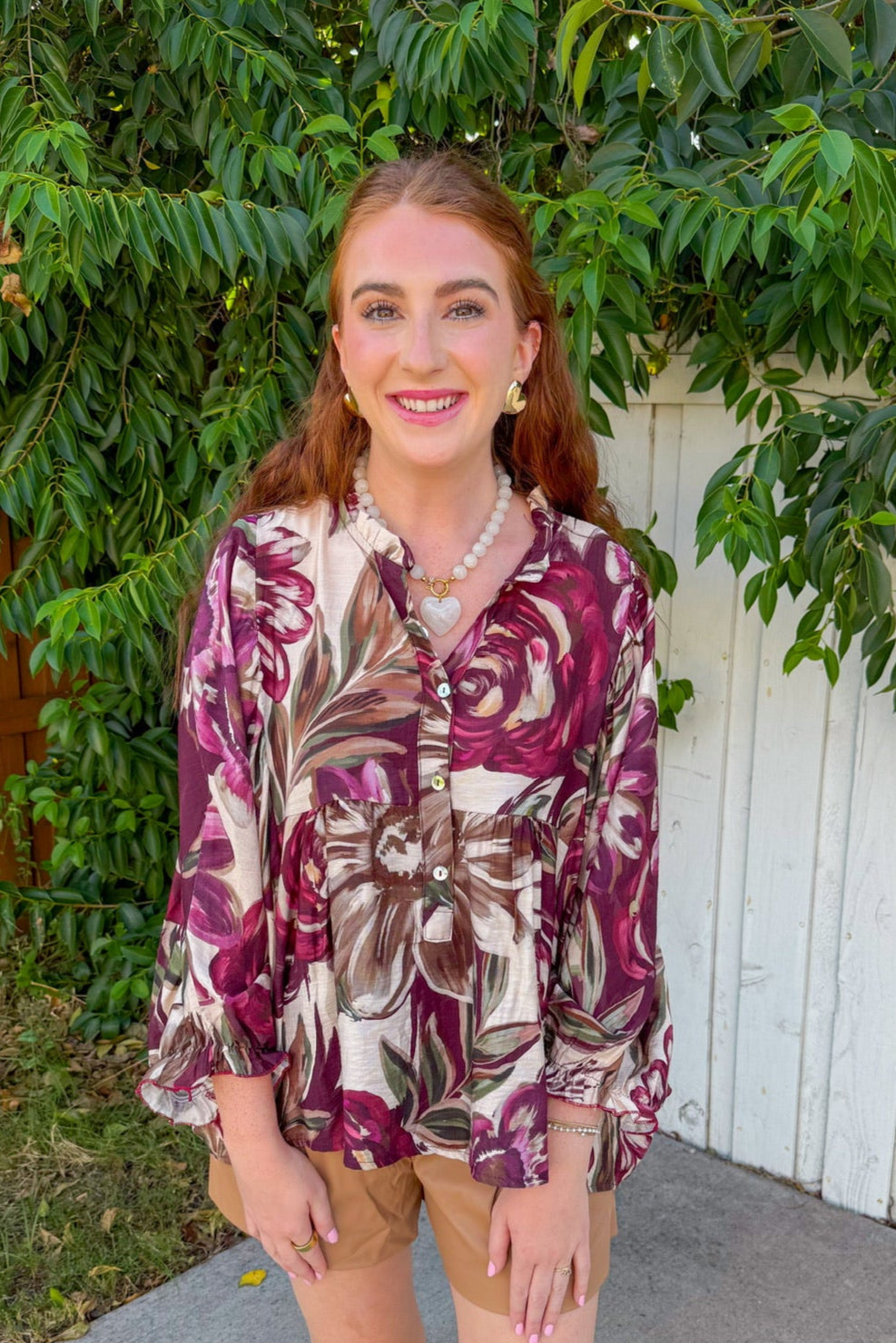 This floral blouse gives fall garden energy with its deep plum, olive, and cream tones swirling together in a dreamy oversized print.