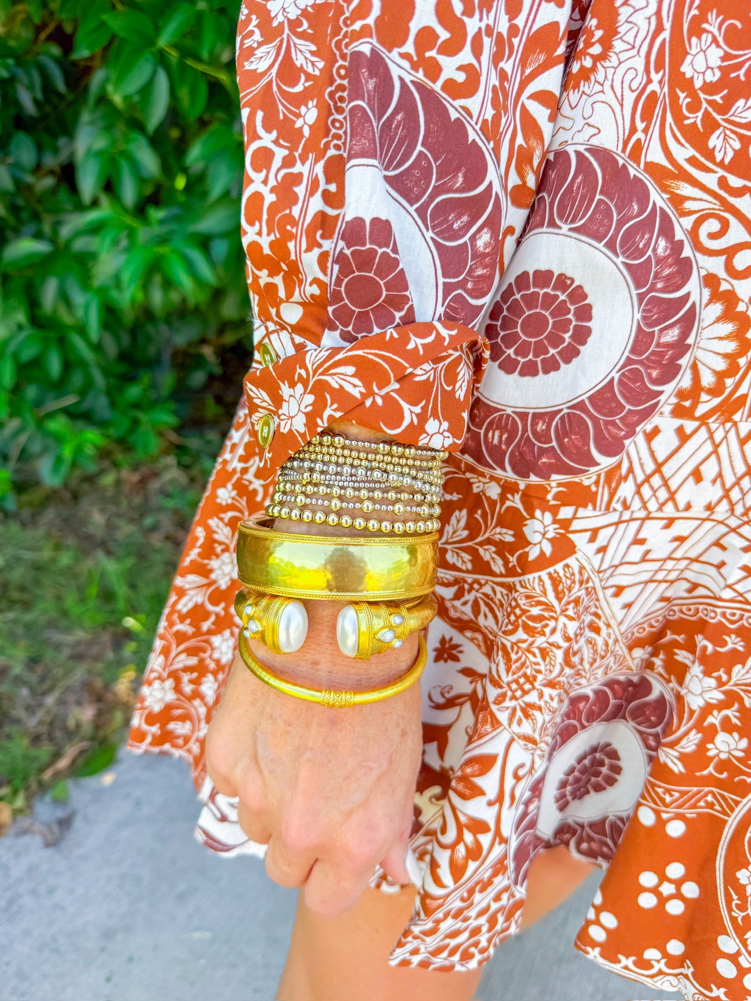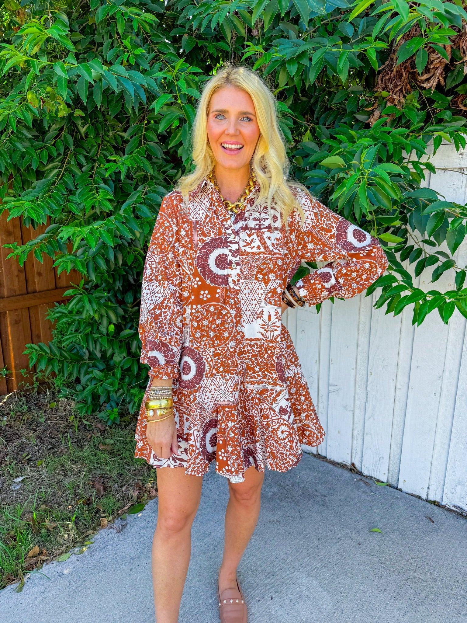 This cinnamon-and-cream patchwork shirt dress is a fall favorite—collared, button-front, and finished with a flirty tiered hem that swings just right.
