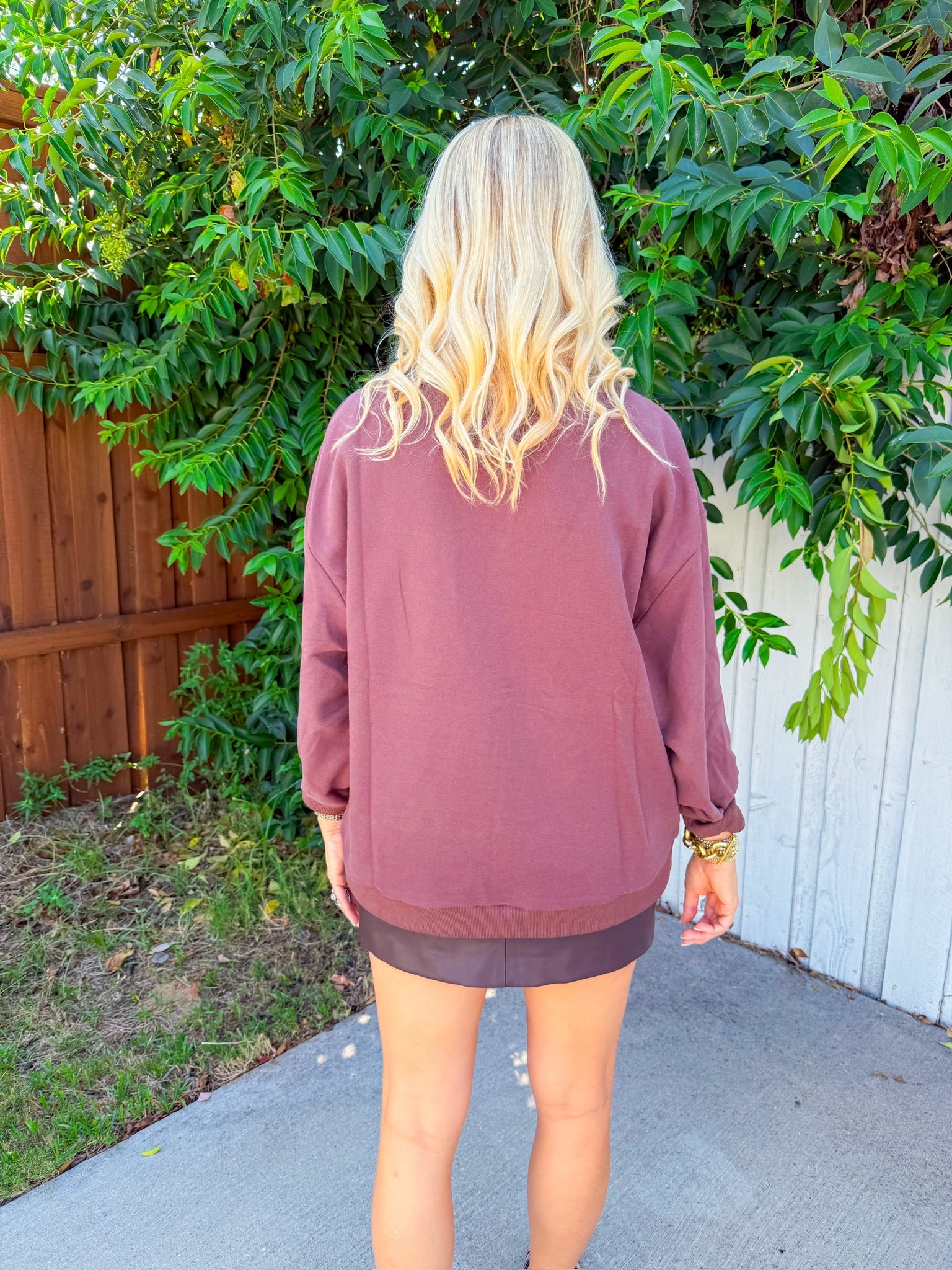 Chocolate crewneck with a rhinestone “Thanksgiving” graphic—soft, cozy, and perfect for pie runs and parade mornings. Throw on with leggings and UGGs for travel day, or half-tuck into straight-leg jeans and sneakers for Friendsgiving prep.
